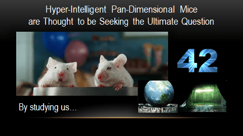 The fact that once again human completely misinterpreted this relationships was entirely according to mice’s plans. There was only one species on the planet more intelligent than dolphins: MICE. The mice used to make experimental observations in the Earth’s laboratories, making them think that the human species were the ones who did the experiment. In short, the Planet Earth is just the answer to ‘the question’ for mice.