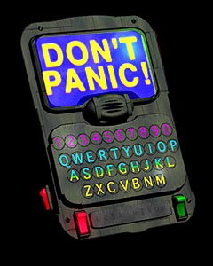 In this picture we can see the ” DON’T PANIC ! ” writing on the cover of book.